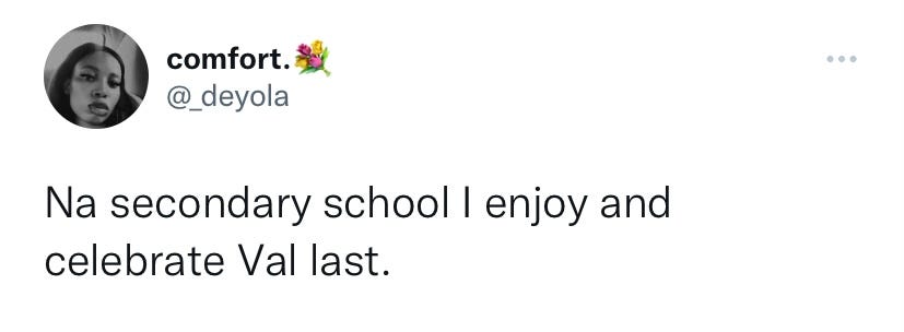 I’ve laughed all day,teared up at some point because I got carried away by the beautiful Instagram videos,bill boards and all the Pictures. They are all so beautiful to see and to be honest,God when exactly? 🥲 I made a tweet about Valentine’s Day in my secondary school and it blew up.